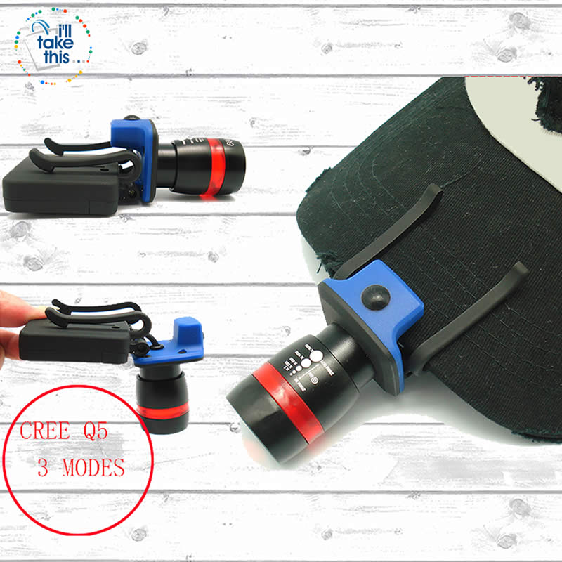 Compact in size it is powered by x3 AAA batteries (not included) and clips onto your hat so your hands are free. Comes in three modes: high, low and strobe.