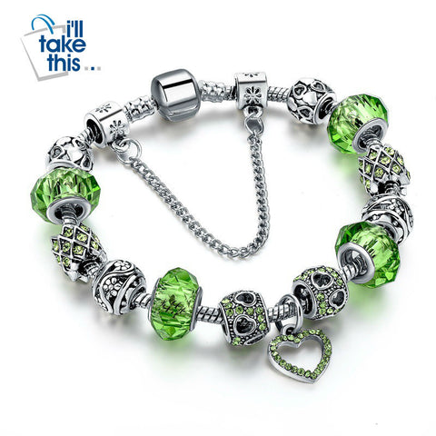 Charm Bracelets - Silver Plated with Heart design in Blue, Green, Pink with Crystal Beads