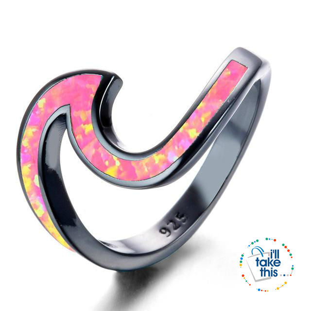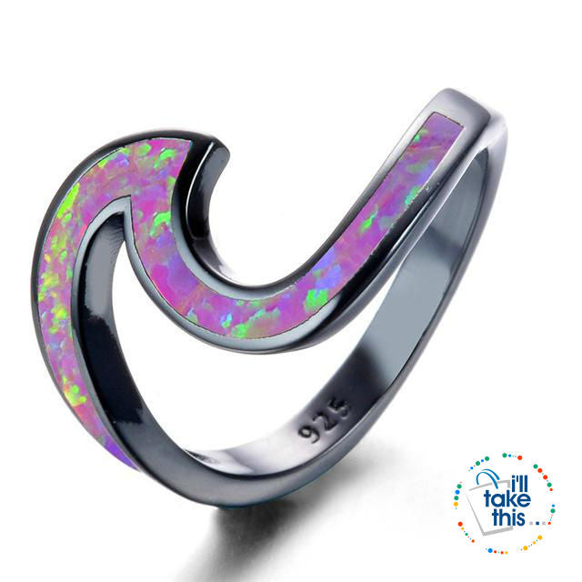 Wave style Fire Opal ring with a Black band, 5 Sizing and interwoven with premium Fire Opal, 5 Color options we're sure you'll find your favorite