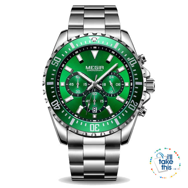 Boasting 3 miniature dials, Minutes, Second and 24 hours, Luminous hours and watch hands plus a stopwatch and calendar all wrapped into this timepiece with stunning good looks make it an unbeatable value.