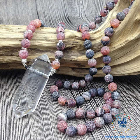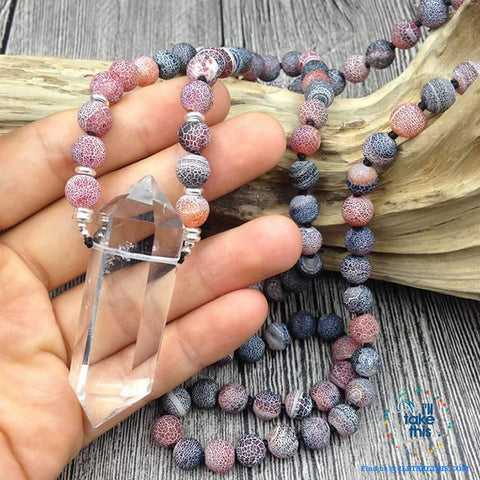 The Necklace has varied shades of Dragon vein Plum colored 8mm Agate with the centerpiece of Natural Quartz Crystal double pointing, the Pendant is a quality piece that will bring positive energy to anyone wearing it. Treat yourself or loved ones to express more love and receive more love around them. Let’s own it!